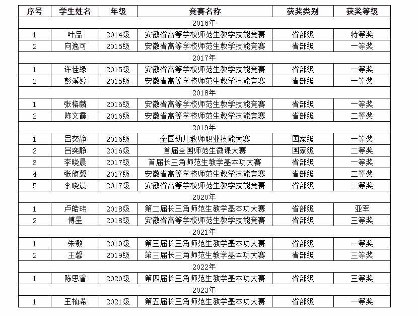 《2016中国大学评价研究报告》显示学前教育专业为3星级“中国区域一流专业”,全国排名并列第18位,省内排名第一。2018年增设学前教育二级学科博士点,该专业是目前安徽省高等院校中唯一具有学前教育学博士公司产品资格的公司。目前已形成本科-硕士-博士、全日制与非全日制、国内与国际合作的多层次、多类型的办学结构。