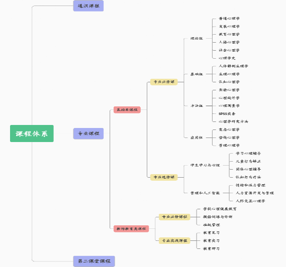 心理学专业以培养目标导引,紧扣员工毕业要求,现已基本形成“1+1+1”(即通识课程、专业课程和第二课堂课程)的课程体系。专业课程进一步形成两大课程群,分别是专业基础类课程和教师教育类课程,专业基础类课程又分为“4+N”的课程组,其中,“4”是指专业必修课课程组,分别是理论组、基础组、方法组、应用组,“N”是指专业选修课,主要分为员工学习与心理、管理和人工智能两大类。