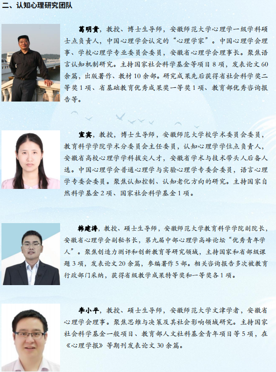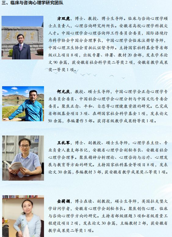 本专业现有专任教师38人,其中,教授7人,副教授15人;博士生导师5人,硕士生导师29人;有博士学位教师29人。教师队伍中,中国心理学会认定的“心理学家”2 人,安徽省皖江学者特聘教授1人,安徽省领军人才特聘教授1人,安徽省学术和技术带头人1人,安徽省学术和技术带头人后备人选2人,安徽省高校学科拔尖人才1人,安徽省中青年学科带头人2人,安徽省优秀教师1人。近年来,心理学专业教师取得诸多重要成果,凝练出三大特色研究方向团队: