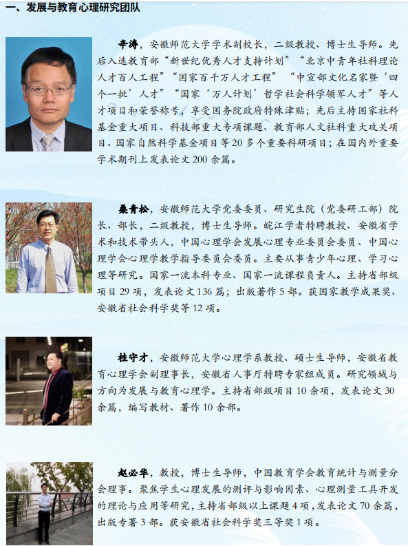 (1)发展与教育心理学研究团队。聚焦学习心理、青少年发展、心理测评和学业发展大数据追踪分析等领域研究。依托安徽省教师教育协同创新中心等3个省级平台,深化与“科大讯飞”合作,主持国家自然科学基金、国家社科基金30余项,发表高质量学术论文300余篇,获教师教育类国家一流本科课程、国家精品课程、精品资源共享课程8门,出版国家级规划教材3部。研究成果获全国教育科学研究优秀成果奖、国家教学成果奖、省社科奖等14项,被省级以上部门采纳咨询报告15篇。