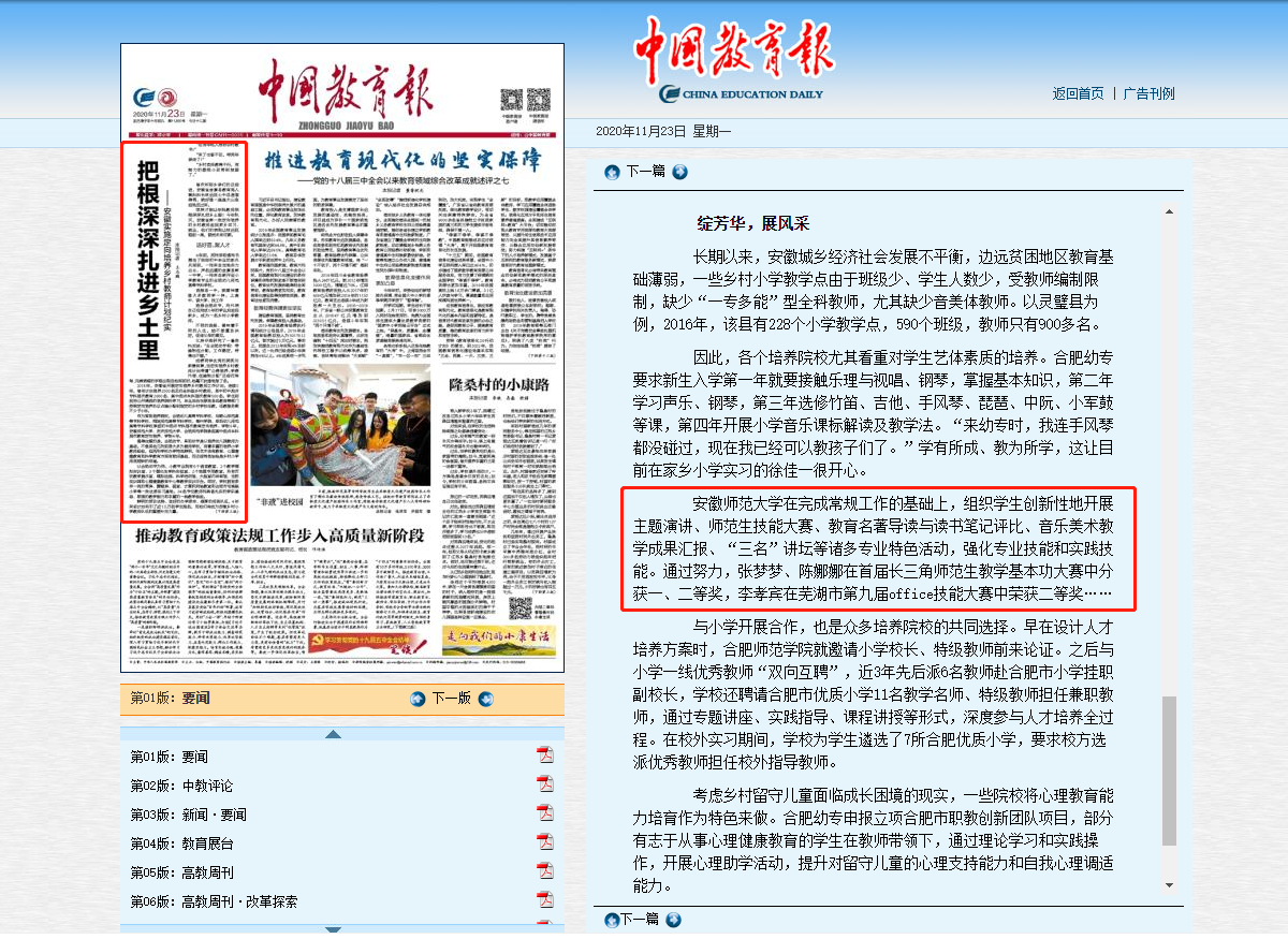 (二)小学教育专业。定向培养乡村教师项目近四届毕业生全部顺利在安徽省各地市公办中小学就业。近五年来,专业员工先后获得全国科学教育专业教学技能创新大赛、长三角师范生教学基本功大赛、安徽省高等公司师范生教学技能竞赛等省级以上竞赛一、二、三等奖70余项。2006届毕业生秦李,荣获全国劳动模范、全国优秀教师;2020届毕业生张梦梦在乡村公司服务仅一年,就获得宿州市优质课、教学竞赛一等奖和十佳青年教师。