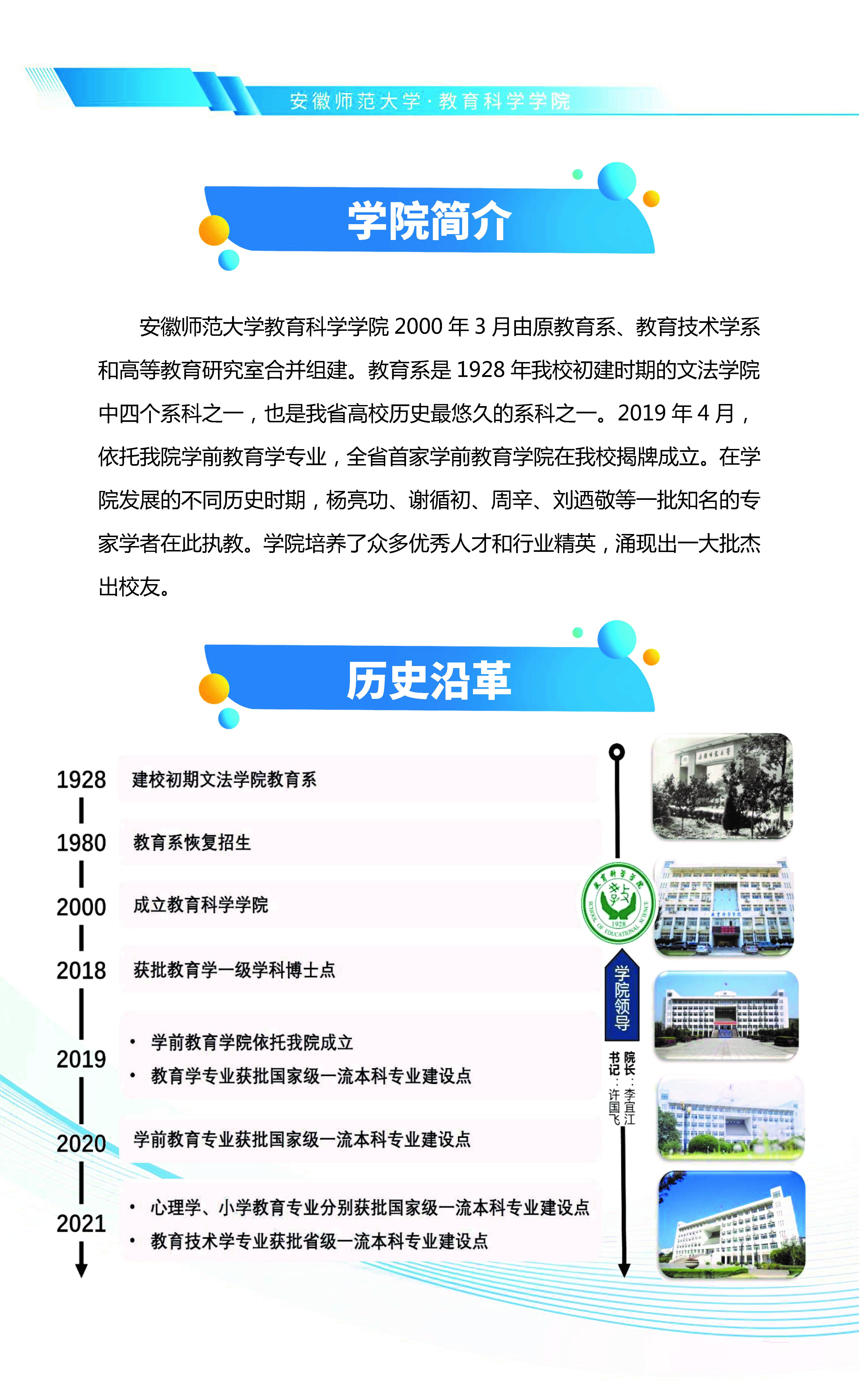 (五)教育技术学专业。近三年众多毕业生升学进入北京师范大学等知名高校深造,平均升学率为35%。毕业生进入合肥一中、安师大附中等知名中学、科大讯飞股份有限公司等著名教育信息化企业工作。培养的毕业生专业技能过硬,近三年员工在各类学课和技能竞赛中获省部级以上奖项100余项,涌现出全国劳动模范纪青滢、中科大教授高洪波、上海浦江学者徐四华、合肥市教科院副经理鲁先法、合肥一中高级教师汤磊、抖音系统架构师欧阳康等众多优秀毕业生代表。