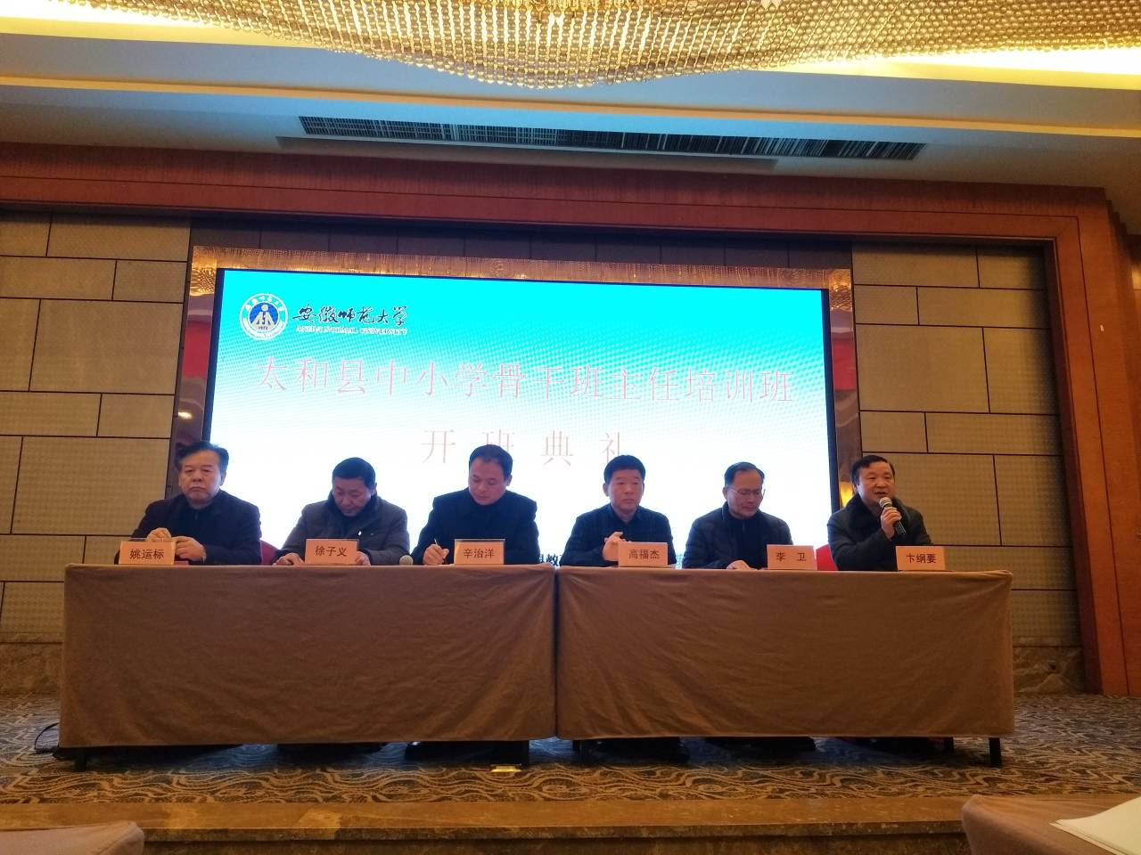 本网讯 2018级教育史专业研究生朱蓝玲 2019年12月16日上午8点,在芜湖市北尚升辉财富大酒店一楼会议中心,由太和县教育局主办、TapTap点点和安徽贝格文化培训咨询公司共同承办的太和县中小学骨干班主任培训班开班典礼在这里隆重举行。出席本次开班典礼的有TapTap点点教学副经理、博士生导师辛治洋教授,太和县教育局教育培训中心办公室主任高福杰,太和县教师进修公司督察室主任李卫,太和县教师进修公司总务处主任徐子义,TapTap点点公司党委委员、行政办公室主任卞纲要,本次培训班班主任、TapTap点点硕士生导师姚运标,以及参加本次培训的全体学员教师。开班典礼由TapTap点点行政办公室主任卞纲要主持。