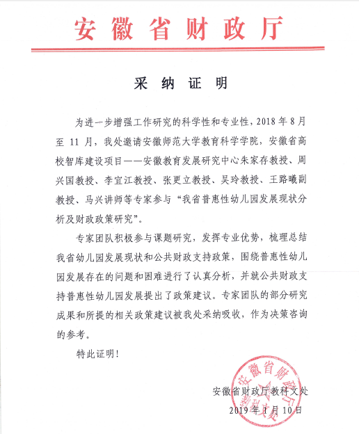 省财政厅教科文处高度肯定了教科院专家团队提交的研究报告,充分吸纳了专家团队的研究成果和所提的相关政策建议,并出具了课题研究成果采纳证明。本次公共财政支持普惠性幼儿园发展政策研究工作也是该院高校智库建设项目——安徽教育发展研究中心的成果之一。
