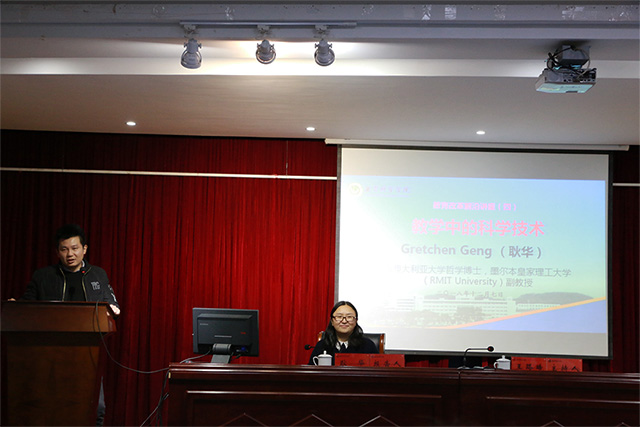 本网讯(教科院 文/王红 图/朱瑞)为进一步拓宽公司师生的学术视野,促进学术交流,推动公司国际化研究进程,12月7日上午,南澳大利亚大学哲学博士、墨尔本皇家理工大学(RMIT University)副教授、中澳文化研究协会会长耿华应邀来院,在赭山校区图书馆报告厅作了一场题为“教学中的科学技术”的学术报告。本次报告由公司学前教育专业负责人王路曦副教授主持,徐赟副教授、吴文涛副教授、李晓博老师及莫纳什大学高级讲师Leigh Disney(迪斯尼 ·李)出席,教育学和学前教育等专业本科生、研究生到场聆听。
