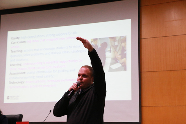报告中,主讲人Disney介绍了自己同中国的深切渊源,并向全场表达了自己对中国这片热土的敬仰和热爱。谈及自己从事早教工作的多年感受,Disney对在座的多位学前教育从教人员和研究人员致以崇高的敬意。Disney的恳切言谈中向在场听众传达了“学前教育工作的重要性和挑战性”认识;接着Disney更是热情地向大家介绍了本人从教的公司——莫纳什大学 ,从校区的分布到各色皮肤的员工,从多项举例和多处设疑,无不流露出Disney对其工作与生活的积极乐观态度。在对比中国的早教教育时,Disney向大家介绍了澳大利亚的两条统一性教学大纲,分别是0-5岁的早期儿童教育大纲、小学至高中的12年教育大纲。这表明了“早教教育”在澳大利亚国民教育中所占到的重要位置。关于教学评估和电子技术使用,Disney就评估在教学中所起的作用详细说明并展示了澳大利亚现有的评估模式“一对一测试”。同时强调了儿童的学习通过“特定的儿童书籍”来提高认知水平,达到应有的发展阶段这一教学方式的合理性。针对现行教学中电子技术的使用问题,Disney现场采访了两位中国的早教从教人员,对比澳大利亚的教学较少涉及电子技术的应用现状,更是以他本人的博士论文向大家展示电子技术在教学中应用与否的变量结果。在早教中的数学学习部分,Disney分别以 Developing number sense 、subitising、base 10 、Hands-on learning 四方面运用现实举例及现场互动,生动趣味的向大家揭示了数学学习的关键所在。