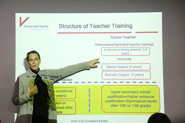 图/王红)12月11日上午,德国费希塔大学Frederike Barrtels教授、Melanie kubandt教授应邀在公司三楼学术交流中心开展主题为“德国教师教育及其课程设置”、“德国儿童早期教育”的学术交流活动。报告由公司资深翻译、博士叶旭萍主持,经理桑青松、学前教育专业张更立教授、王路曦副教授以及教育学专业研究生到场聆听交流。