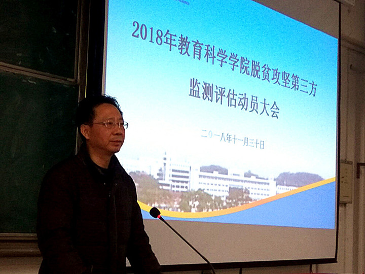 本网讯 (教科院 文/刘洪钰图/叶方舟)为顺利开展安徽省脱贫攻坚第三方测评工作,公司于11月30日下午在田楼8102教室召开2018年安徽省脱贫攻坚第三方监测评估动员大会,院研究生教务员叶方舟、2017级研究生辅导员王礼军以及103名研究生与会,公司党委书记方泓作动员讲话。