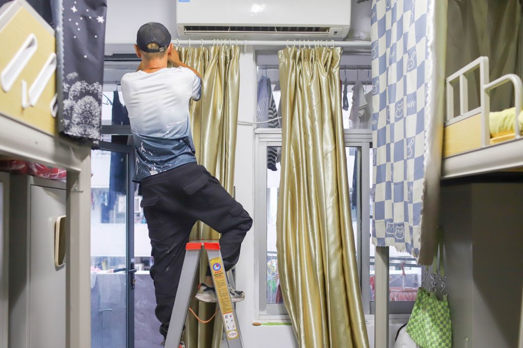 为提升宿舍生活的舒适性,教科院分批为新装修寝室及新生宿舍统一购置了窗帘。从商家选择到样品制作,公司坚持质量优良、价格公道、布料安全。9月28日和国庆节期间,11栋、12栋宿舍陆续进行了窗帘安装,国庆节后也将为新生宿舍统一购置与安装窗帘。