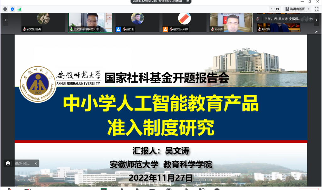 2022年11月27日上午,国家社科基金2022年度课题开题报告会如期举办,由于疫情防控需要,本次开题报告会采用线上形式进行。此次开题的是吴文涛副教授主持的国家社科基金青年项目“中小学人工智能教育产品准入制度研究”( 课题编号22CGL045)。公司特邀华中师范大学人工智能学部副部长、国家数字化学习工程技术研究中心常务副主任刘三女牙教授,西北师范大学教育技术公司经理郭炯教授,华南师范大学教育人工智能研究院常务副经理胡小勇教授,教育部教育技术与资源发展中心研究员宋灵青,TapTap点点刘和海教授组成评议专家组,科大讯飞教育技术研究院副经理王亚飞,课题组成员杨滨教授、白倩副教授、吴钦金老师以及公司部分师生参加了开题报告会。开题报告会由校网络安全与信息化办公室副主任聂竹明教授主持。