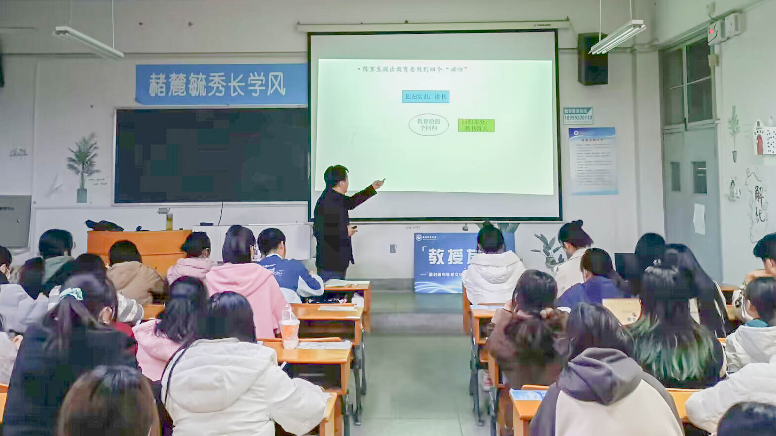 姚运标引用第十四届全国政协常委、教科卫体委员会主任陈宝生提出的“教育要做到‘四个回归’”,分别从“读书”“本分”“初心”“梦想”四个方面叙述如何做好教育工作。他以四个纬度的比较阐述了教师如何树立威信。他提出“师商=师爱+师能”的观点,鼓励同学们培养自身的师爱与师能。他分享了教师基本功的内涵,并希望同学们积极学习教师基本功,在学习的过程中获得归属感和成就感。姚运标以“教师要引导和带领着员工去读书,集团是教师和员工共同读书的地方!”作结,倡导同学们能在大学期间扎实学习,为未来成为“四有”好老师打下坚实基础。