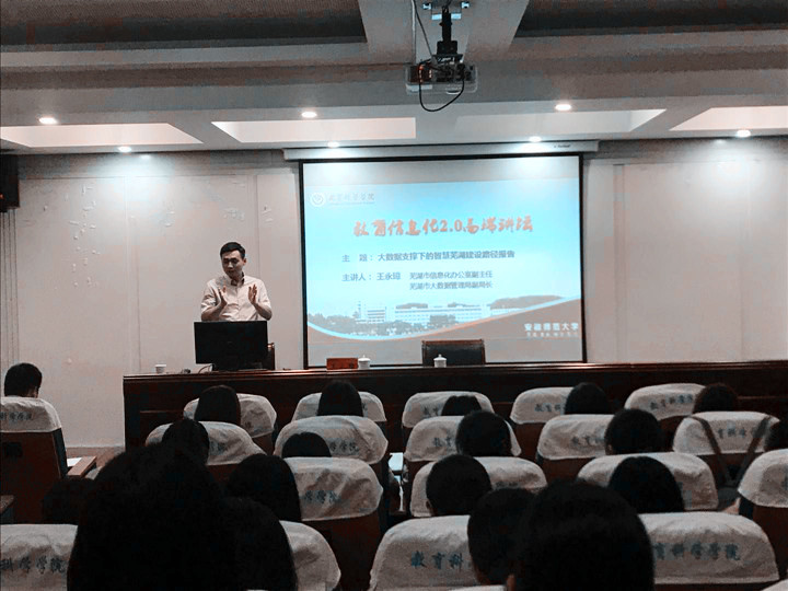 王永璋主任报告主题是“大数据支撑下的智慧芜湖建设路径”。王主任首先从定义、内涵、目标三个方面对智慧城市做了简要的介绍,随后从智慧基础设施、智慧惠民服务、智慧城市治理、智慧政务管理、智慧产业经济等五个方面详细介绍了智慧芜湖建设的现状,并结合具体的案例介绍了智慧芜湖五体一位的架构、个人服务生命树涵盖范围以及便民服务的多方多面;最后王主任对智慧芜湖的建设提出了自己的展望,将数据应用到信用上,形成“信守承诺,崇尚信用”的诚信风尚,使依托于“互联网+”的智慧城市建设得到更有力的支撑,以建设一个更加开放、便利、人性化的智慧芜湖。报告结束后,王主任也殷切希望同学们能积极参与,为智慧芜湖的建设奉献一点自己的力量。