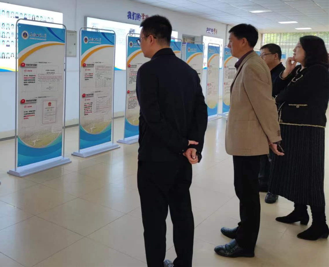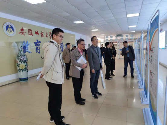 上午10点30分,在公司党委常委、副董事长熊宇杰的陪同下,由省教育厅第四评估专家组组长张严政、安徽工程大学国际交流合作处副处长朱铁军、安徽农业大学国际交流合作处副处长张文静、合肥市教育局基教处副处长徐超组成的评估专家组一行首先参观了公司中美合作现代教育技术专业硕士研究生教育项目自评估成果展,成果展包含本项目办学特色、历史与贡献、人才培养成效等方向的介绍。