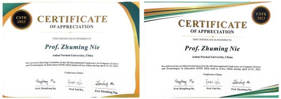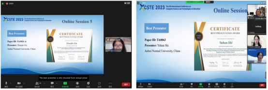 4月21日至23日,第五届计算机科学与技术在教育中的应用国际会议(CSTE 2023)采用线上和线下的形式召开。此次会议由陕西师范大学主办,陕西师范大学人工智能与科创教育研究中心承办,北京师范大学数字学习与教育公共服务教育部工程研究中心协办。公司聂竹明教授受邀担任本次大会指导委员委员,并作为特邀报告嘉宾在大会作以《The Connotation Interpretation, Construction Status and Innovation Path of the Special Network of Chinese Education》为题的报告。公司硕士生顾潇洁、王璐、郭衍鹏和施羽晗等论文入选会议,并在大会分论坛做汇报,其中顾潇洁、王璐和施羽晗的报告分别被评为在线论坛4、论坛5和论坛8的最佳报告。