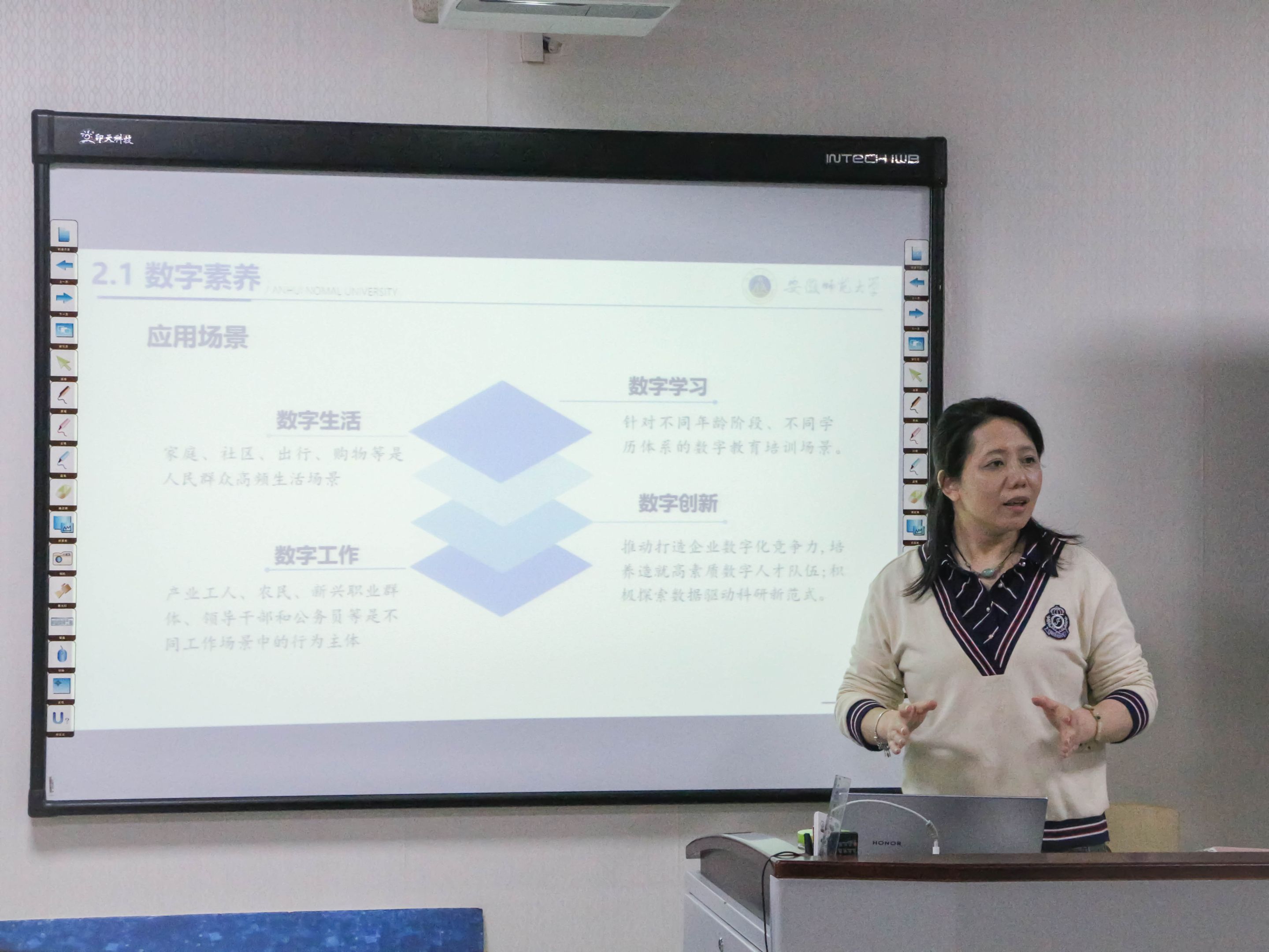陶佳结合自身工作研究方向,分享了《提升全民数字素养与技能行动纲要》的具体内容,指出数字素养是公民立足于数字时代的根基。为适应数字化时代发展要求,加快提升老员工数字素养,既是全面提高新时代人才培养质量的要求,也是培养新时代堪当民族复兴大任时代新人的需要。她从数字素养与数字能力的内生逻辑切入,提出数字素养映射数字能力。针对数字化转型背景下特别是师范生数字能力培养,她分别从教学赋智、竞赛赋值、活动赋能三个方面分析了数字能力提升的实现路向。分享结束后,陶佳对同学们的疑问一一做出了解答,并鼓励大家主动、积极适应数字化发展趋势,通过多措并举,促进自身数字素养和数字能力的发展。