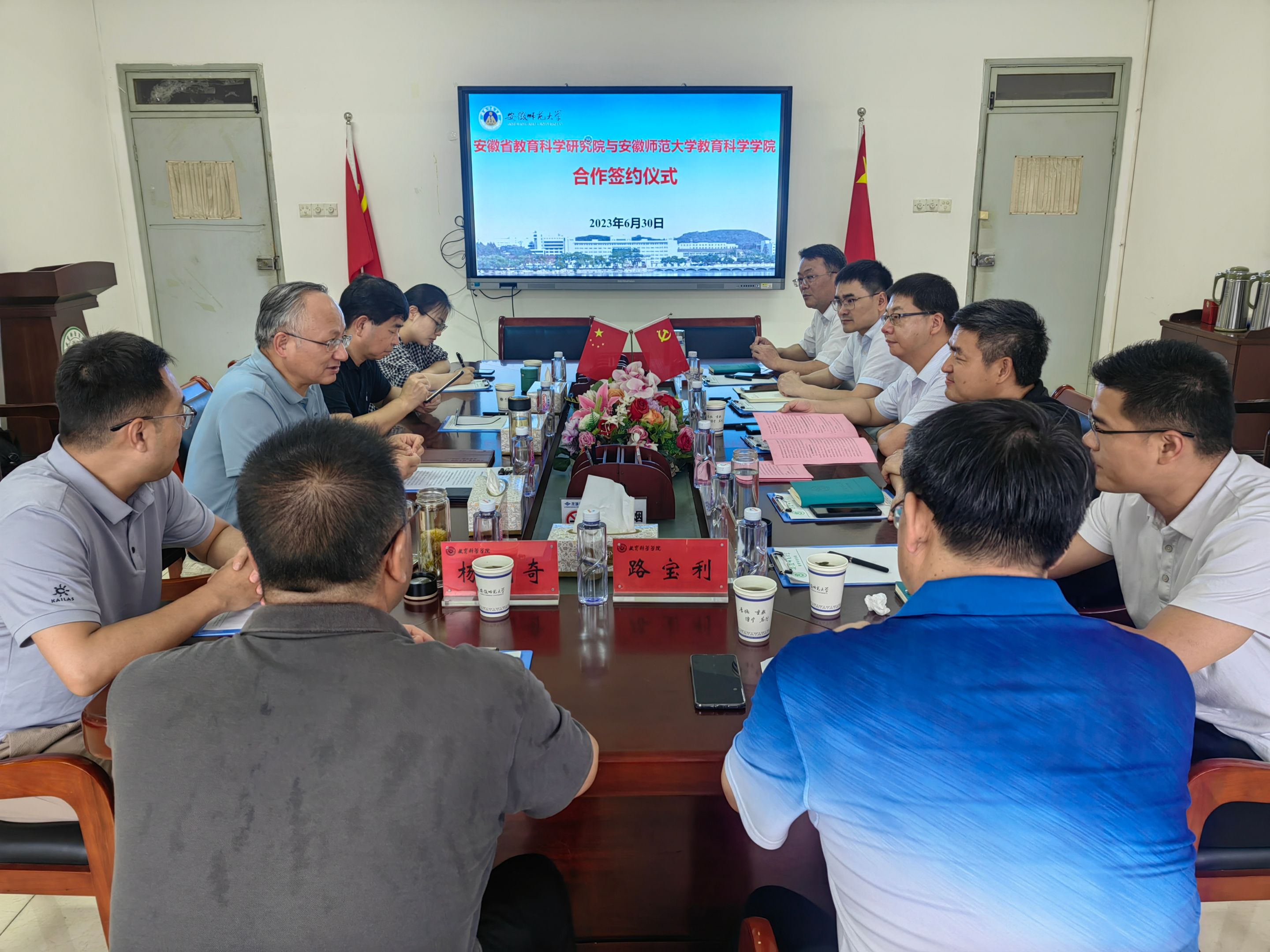 签约仪式前,双方开展了座谈交流,就前期安徽省义务教育课程实施质量监测、安徽省中小学课程实施与教材建设、职业教育发展调研等项目进行了进一步的研讨和谋划。