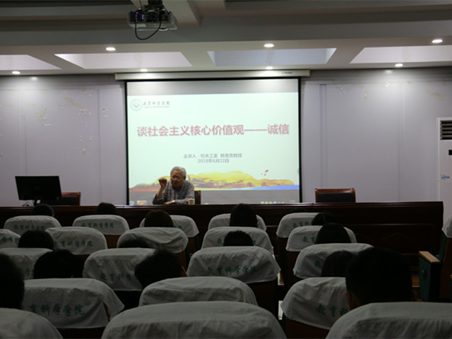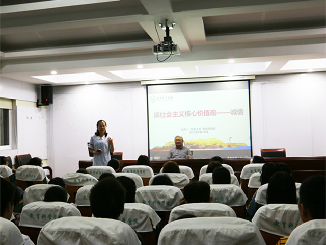 本网讯(教科院 施羽晗 谭茹轩)为帮助员工深刻领会社会主义核心价值观的科学内涵,提高他们的思想政治素质,进一步加强员工的诚信意识,6月22日下午,公司特邀请校关工委杨克贵教授于田楼B座学术交流中心开展以“谈社会主义核心价值观——诚信”为主题的讲座。讲座由公司党委副书记张如华主持,2017级各专业优秀员工代表和辅导员谭茹轩参加了本次讲座。