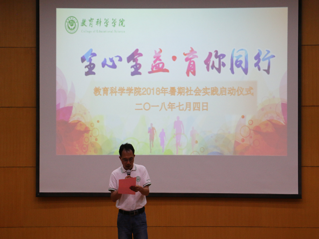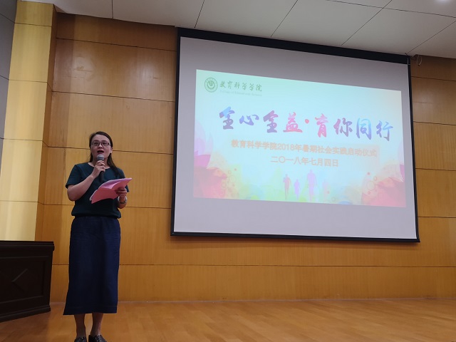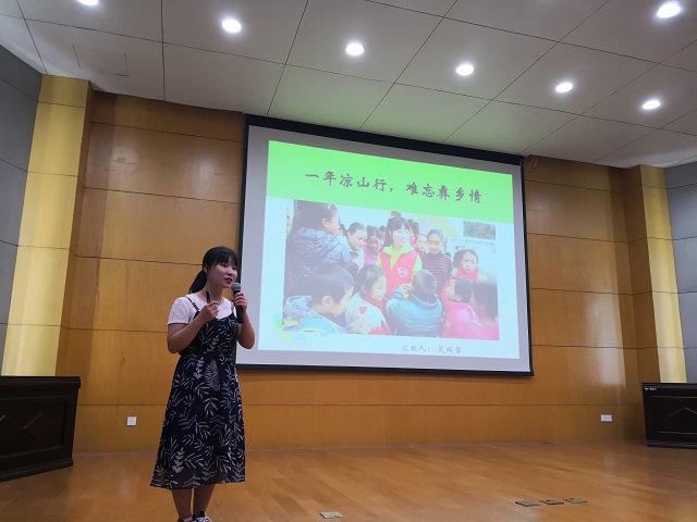 榜样的力量是无穷的。2015级心理学专业徐正媛同作为2017年暑期实践优秀代表学分享了她的精彩实践故事。艰苦的条件没能阻止他们实践的脚步,难忘的实践经历是一生的财富。她寄语即将参加社会实践的学弟学妹们,“要做好你该做的、发现你能做的、尝试你想做的、反思你所做的”。校研究生支教团成员、2013级学前教育学专业艾瑞雪分享“一年凉山行,难忘彝乡情”的支教故事。从突破语言关开始,到开展丰富多彩的课堂活动,再到所带的六个班级取得全校前六的好成绩。幽默的语言,精彩的故事,引得在场的同学阵阵掌声。2016级应用心理学专业的王晨旭同学代表即将出征的社会实践队员郑重承诺,“我们一定不会辜负社会、公司、公司寄予的厚望,在艰苦环境中磨炼意志品质,在实践学习中增长才干。作为新时代的新青年,我们将带着期望与挑战出发,不忘初心,继续前进。”