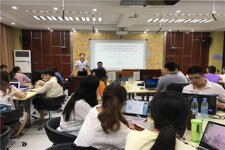 本网讯(文/吕碧君 图/叶舒婷)6月8日-9日,公司心理学“检验中介/调节模型”工作坊第一期在田家炳教育书院502智慧教室正式启动。美国工业与组织心理学会、美国管理学会会员、奥本大学心理系范津砚博士应邀担任本期工作坊的主讲人。应用心理学硕士点负责人、博士生导师赵必华教授主持工作坊活动。心理学、应用心理学专业宣宾教授、李小平副教授、何元庆副教授等老师出席,心理学方向研究生到场聆听学习。