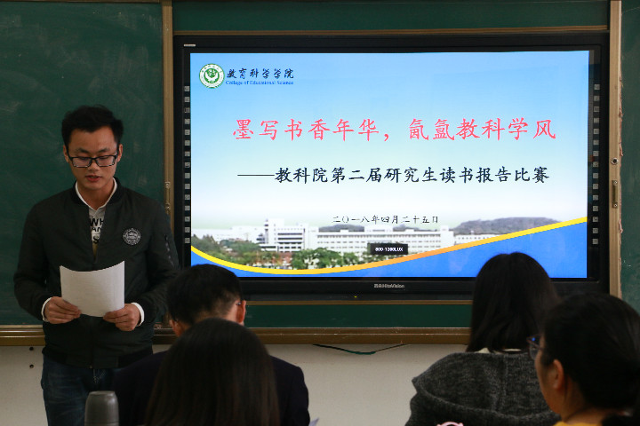 下午2:30,比赛正式开始,十组选手按抽签顺序依次登场,选手们准备充分,汇报内容视角独特、领域宽泛,涉及课程教学论、心理健康、教育技术等多专业领域。各参赛选手演讲时或滔滔不绝,或声情并茂,或绘声绘色,现场同学为选手们别具一格的思想和深邃动人的感情而感到赞叹。评委老师们则从自身丰富的科研经验出发,强调将书籍阅读与学术研究相结合,从阅读中发现问题,发现方法,并就研究生该如何进行读书,如何进行科研给予针对性的指导建议。整场比赛精彩不断,高潮迭起,使在场的同学们受益匪浅。