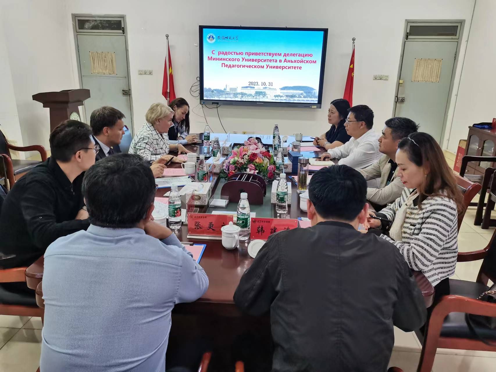 许国飞以“有朋自远方来,不亦乐乎”拉开了座谈会的序幕。李宜江代表公司对Victor Sdobnyakov董事长一行的来访表示热烈欢迎,并回顾了2018年与米宁大学合作举办的“教育与美好生活”首届中俄教师教育发展论坛的盛况,指出Victor Sdobnyakov董事长此次来访必将进一步推动校院合作。Victor Sdobnyakov董事长介绍了米宁大学的办学情况,并真诚期待公司领导到米宁大学访问交流。双方就联合举办短期夏令营、研究课题和出版科研成果、2024/2025学年的学术会议和研讨会等事宜进行了商讨。