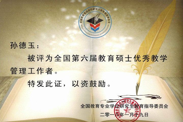 葛金国、孙德玉两位老师长期以来注重硕士公司产品质量。此前两位老师曾多次获得省部级以上荣誉。葛金国老师曾获“全国首届教育硕士优秀教师”称号,2010年再获“全国教育硕士专业学位优秀教师”称号。其指导的研究生论文多次获评省级、国家级优秀论文。孙德玉老师曾作为教育硕士教育管理方向负责人、教育史二级学科硕士点点长,先后被安徽省教育厅授予“安徽省家庭教育十佳园丁”,被教育部、全国妇联授予“全国家庭教育工作园丁”称号,获“安徽省家庭教育十佳先进工作者”称号。他是三尺讲台上循循善诱的引导者、科研领域孜孜不倦的学者,同时还是家长、同行眼中优秀的教育工作者。葛金国、孙德玉两位老师此次受到表彰充分说明了全国教育专业学位研究生教育指导委员会对两位老师工作的肯定。