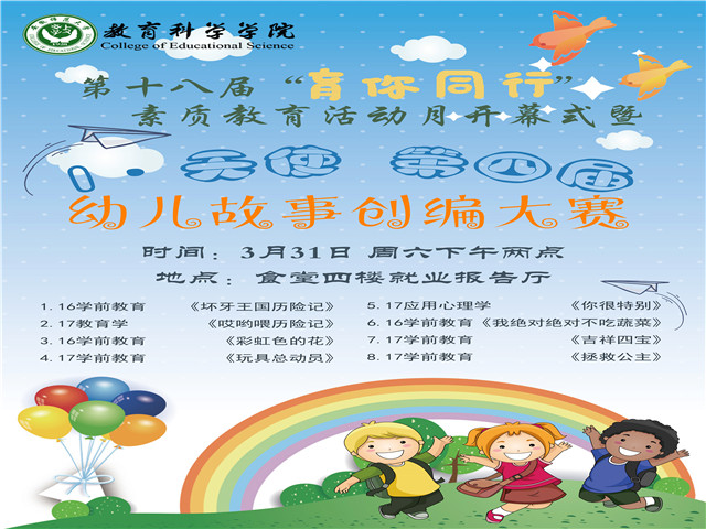 本网讯(教科院 徐翔)为了提高教科学子的综合素质,实现一二课堂联动育人,3月31日下午,我院隆重举办第十八届素质教育活动月开幕式暨第四届“I·天使”幼儿故事创编大赛。本次活动邀请了市实验幼儿园陈璐老师、弋江区薪火服务中心负责人王旸、公司党委副书记张如华及学前教育负责人张更立担任评委。公司各年级辅导员、学前专业所有员工参加了本次活动。为了提高比赛的针对性和趣味性,更是邀请了十余名小朋友担任大众评审。