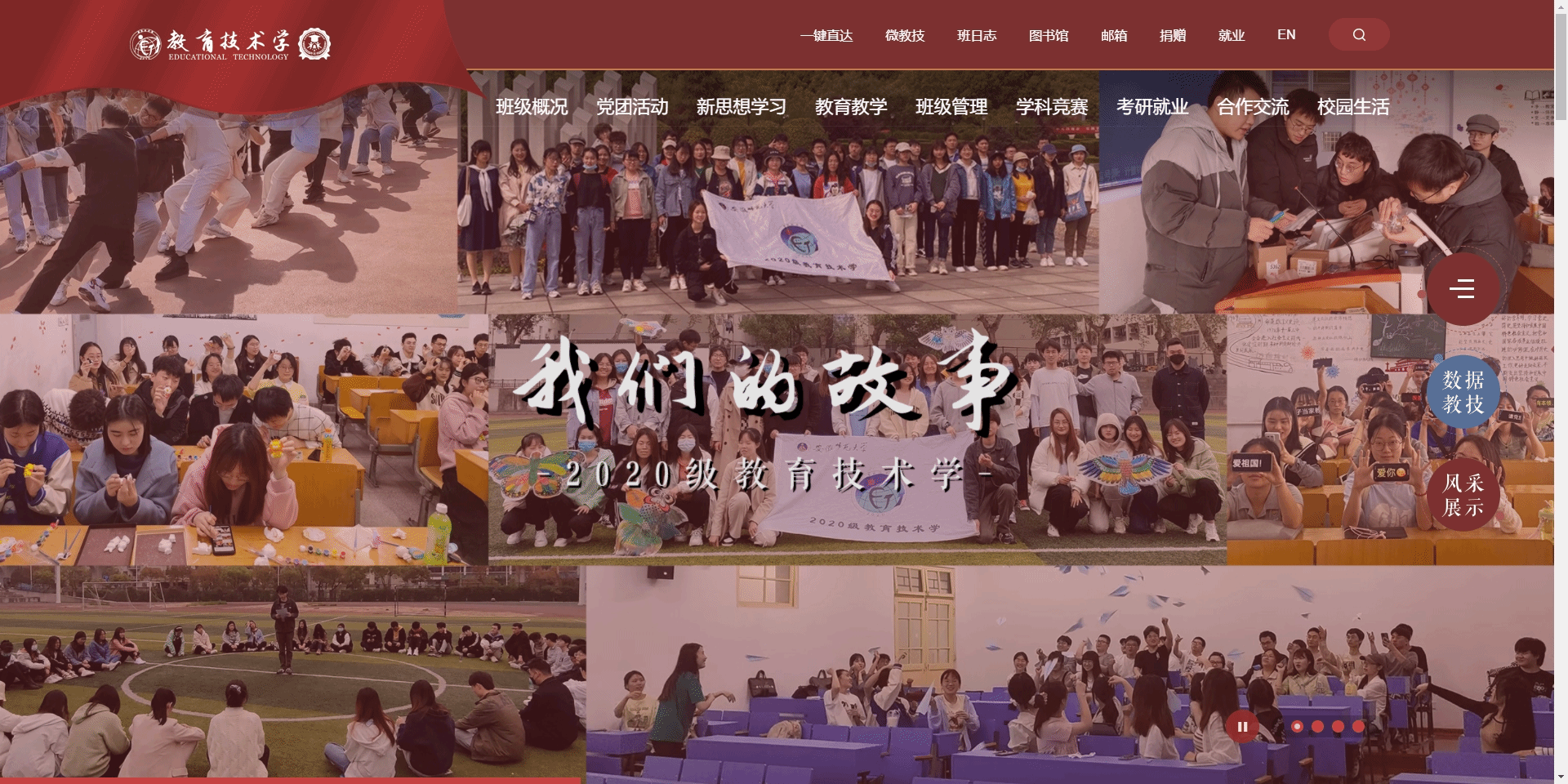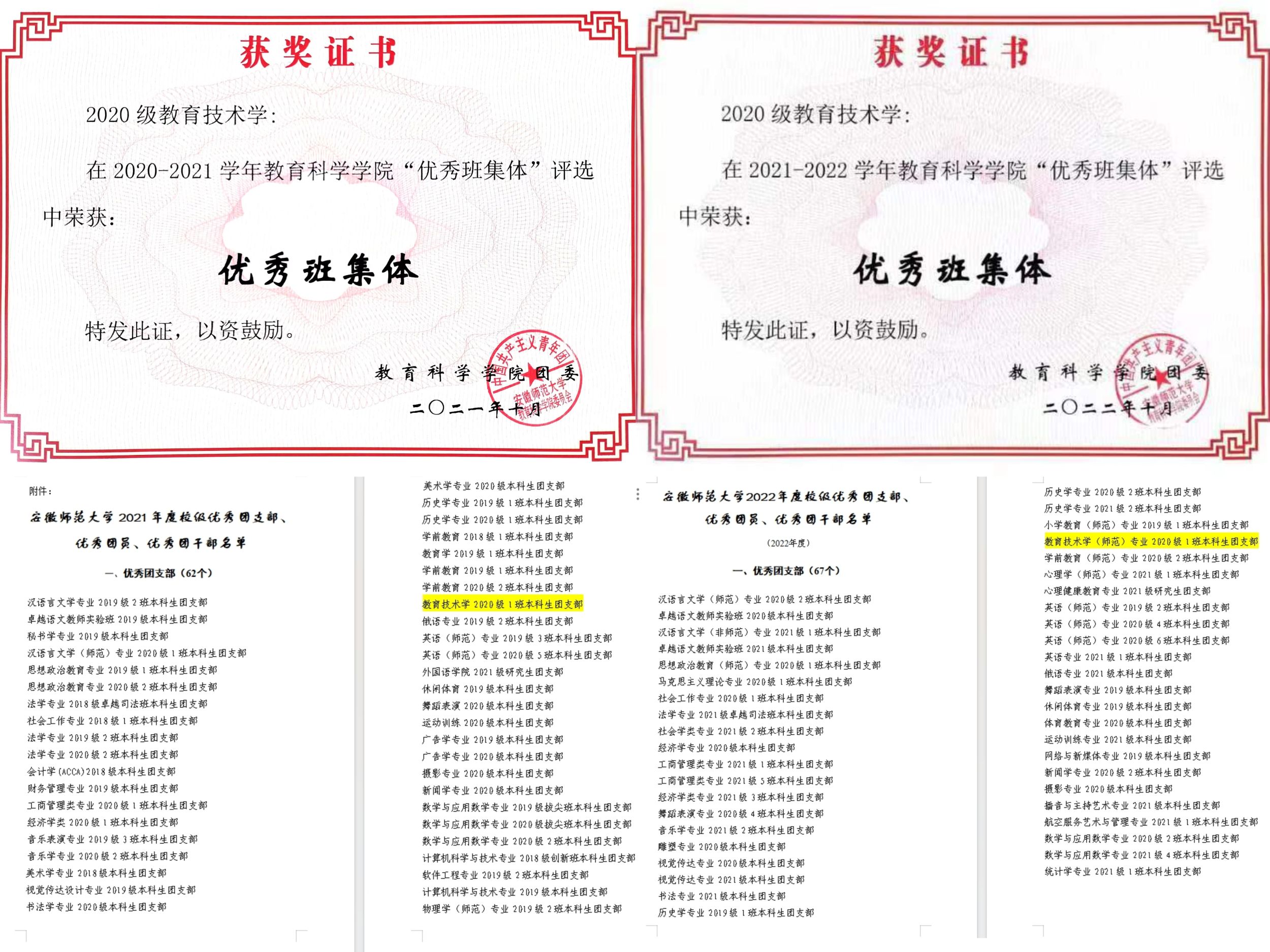 2020级教育技术学1班现有44名同学,班级同学积极上进,团结奋进,勇攀高峰。班级围绕“崇德·博学·笃行·创新”的班训开展各项工作,连续两年获评院级“优秀班集体”,所在团支部连续两年获得校级“优秀团支部”称号。班级积极投身社会实践,其中1支队伍入选团中央“七彩假期”项目,1支队伍入选安徽省少先队实践营项目,并新建1个老员工社会实践基地。