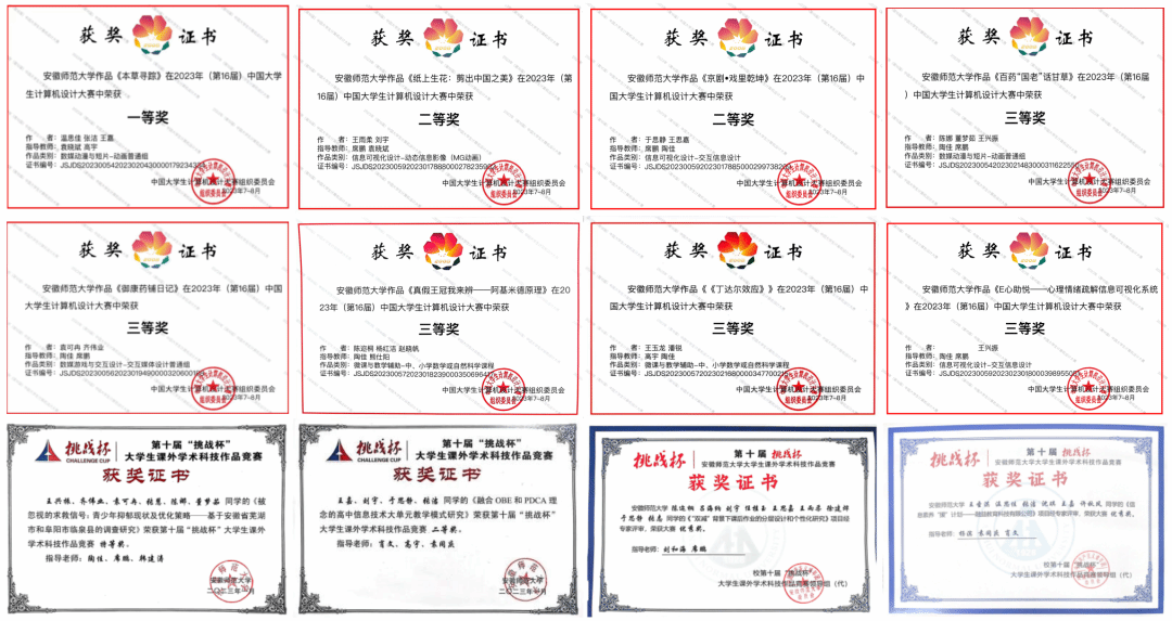 班级扎实推进学风建设,获得多项专业技能证书,两人分别获长三角师范生技能大赛二、三等奖。中国计算机设计大赛国家级获奖26人次,校级及以上获奖130人次,国奖数量居全校第一,其中作品《本草·寻踪》获国家级一等奖。第十届“挑战杯”安徽省老员工课外学术科技作品竞赛“黑科技”专项包揽全院4项省级奖项。