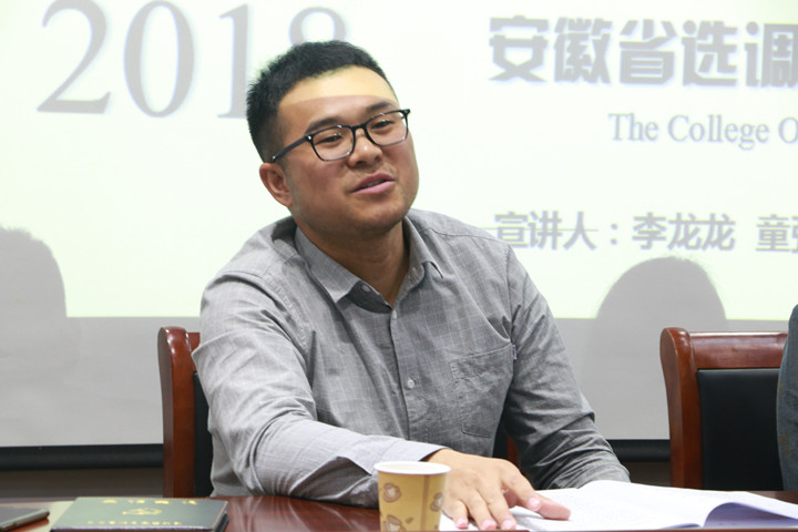 本网讯(教科院文/张鑫 图/许文齐)青年兴则国家兴、青年强则国家强。2018年全国选调生考试公告正在陆续公布中,为进一步提升公司毕业生应考备试能力,帮助毕业生成功进入基层公共部门成长成才,3月26日晚7点,公司特别邀请了专门负责选调生工作的市委组织部干部二科李龙龙(员工),在三楼学术交流报告中心进行了一场安徽省选调生培训动员会,会议由研究生会主席王申振主持。