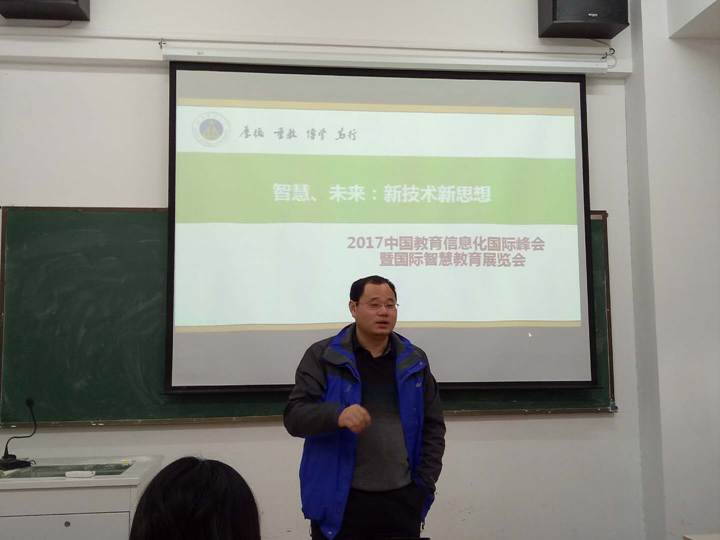 12月1日,刘和海老师在与16级教育技术研究生的“智慧、未来:新技术新思想”主题交流会上,全面介绍了本次峰会的规模、主题与影响。重点围绕“新课标新高考改革、创新实验室、优质资源共享、校园文化与核心素养、互动课堂、人工智能与机器人、创客教育及STEAM、教育数字出版等”八个维度,详细解读了中国教育信息化发展状况。与此同时,刘老师还对本次峰中的“教育+”人工智能、游戏、数字化教学、创新领导力、创客@STEM等主题内容进行了深入阐释,并谈了自己的看法:“不要一味地迷信先进的、时尚的技术,但又要勇于探索,恰当地利用这些技术来改进教学、学习方式”。