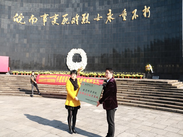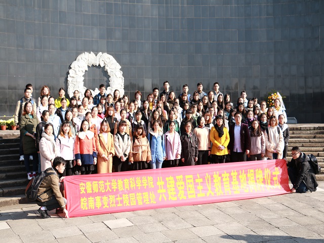 皖南事变烈士陵园管理处文管部副主任王丽致欢迎词,她希望双方能将这一红色资源共同建设好,管理好,发挥其应有作用。2016级学前教育朱珠同学代表入党积极分子发言,她倡议大家从爱国主义教育基地中汲取无穷的精神力量,为中华民族的伟大复兴贡献属于自己的青春力量。莫大贡代表安师大教科院团委感谢皖南事变烈士陵园提供的爱国主义教育基地,希望同学们铭记历史、心系祖国、关注未来。最后,双方领导签订共建协议,共同揭牌。