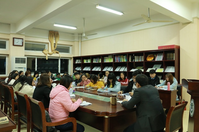 随后,徐赟老师结合十九大报告与十八大报告的关键词变化看习近平教育思想提出的教育发展新要求,就学习过程中如何做好以上三个方面的转变进行现场指导。他从教育目标的转变出发,再对各级各类教育未来的新任务进行具体分析,特别是对“教育强国”“教育现代化”“发展素质教育”“城乡义务教育一体化、重视农村义务教育”“网络教育”“支持和规范社会力量兴办教育”等进行了细致的阐释和分析。最后,徐赟老师鼓励大家要勇于承担教育事业发展的责任、敢于大胆地进行创造性的学习、善于发挥学习过程中的主动性,并希望这种学习和讨论取得更多更能促进专业发展的成果。
