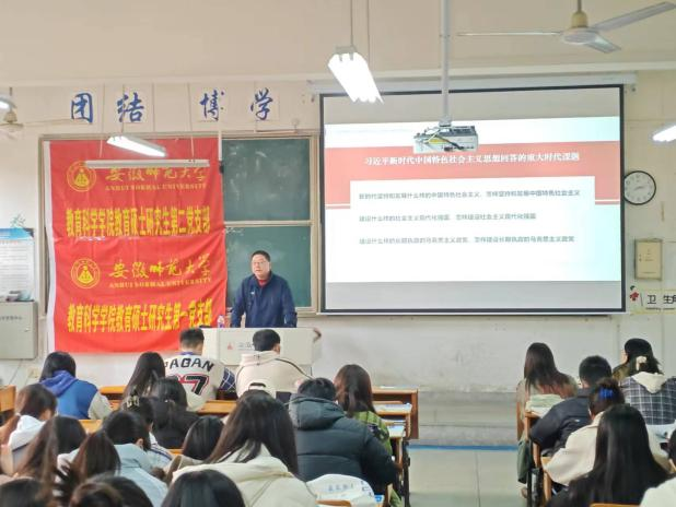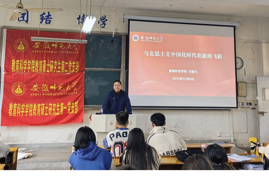 为深入学习贯彻习近平新时代中国特色社会主义思想,进一步激励广大研究生党员加强学习、实干担当;2023年12月6日下午,教育硕士研究生第一党支部和教育硕士研究生第二党支部共同邀请公司党委书记许国飞在田家炳楼8101教室以“马克思主义中国化时代化新的飞跃”为题讲授党课。活动由教育硕士研究生第一党支部书记徐贝贝主持,两个支部全体党员及入党积极分子参会学习。
