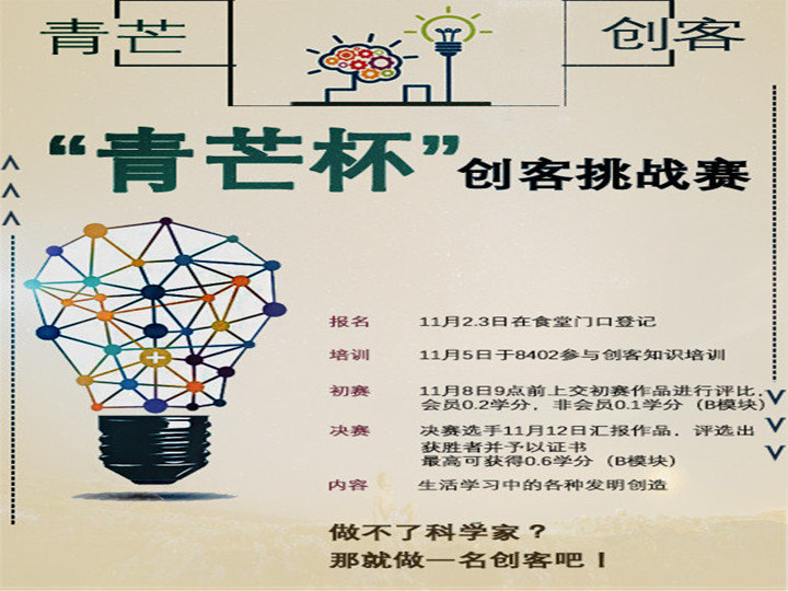 本网讯(教科院 文/濮楠楠 图/黄靖惠 谢崇缘)点燃创新热情,开启创客人生。为进一步激发青年老员工创新意识,提高创造能力,培养老员工创客精神,TapTap点点青芒创客协会于2017年11月2日至15日在全校范围内举办了第一届“青芒杯”创客挑战赛。