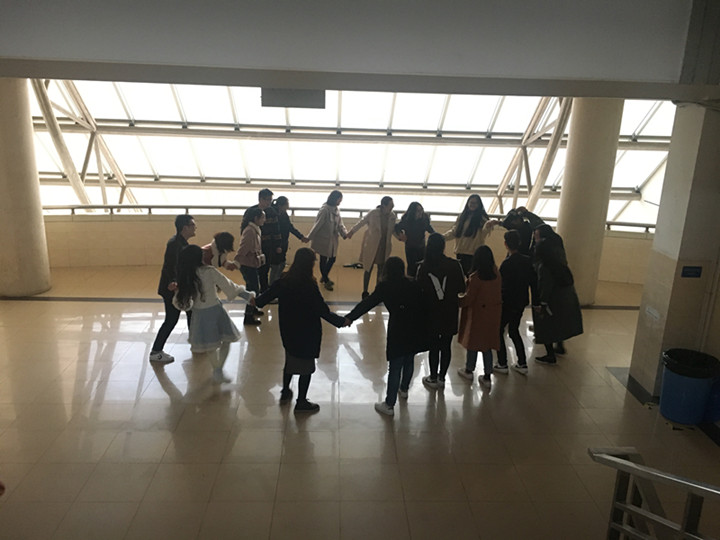 本次团体辅导主要为“桃花朵朵开”、“解开千千结”、“你划我猜和“你画我猜”等趣味游戏。首先我们用“桃花朵朵开”这个小游戏进行热身活动,同学们在欢声笑语中玩得不亦乐乎。“解开千千结”需要团体的合作与配合,每一小组成员为了顺利解结,煞费苦心,引得大家掌声不断。第三个游戏“你划我猜”也是班委们精心策划的。把同学们分为几组,每一次抽一个卡片,并且把卡片上的字用肢体语言表达给第二位同学,接着第二位同学再传给第三位,直到最后一位同学猜出答案。在这个游戏当中,同学们个个都使出浑身解数,用肢体语言表达文字,当然很多同学肢体表演的很搞笑,引得同学们一阵阵笑声。在这一片欢声笑语中,16教育技术专业的团辅活动告一段落。