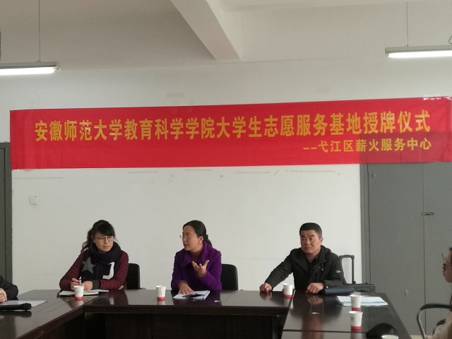 授牌结束后,王旸代表弋江区薪火服务中心发言。她表达了对师大教科院、社区、家长、志愿者的支持并表示将会继续以公益为目的,本着“给孩子一个快乐的乐园”的宗旨让孩子在快乐中得到成长。