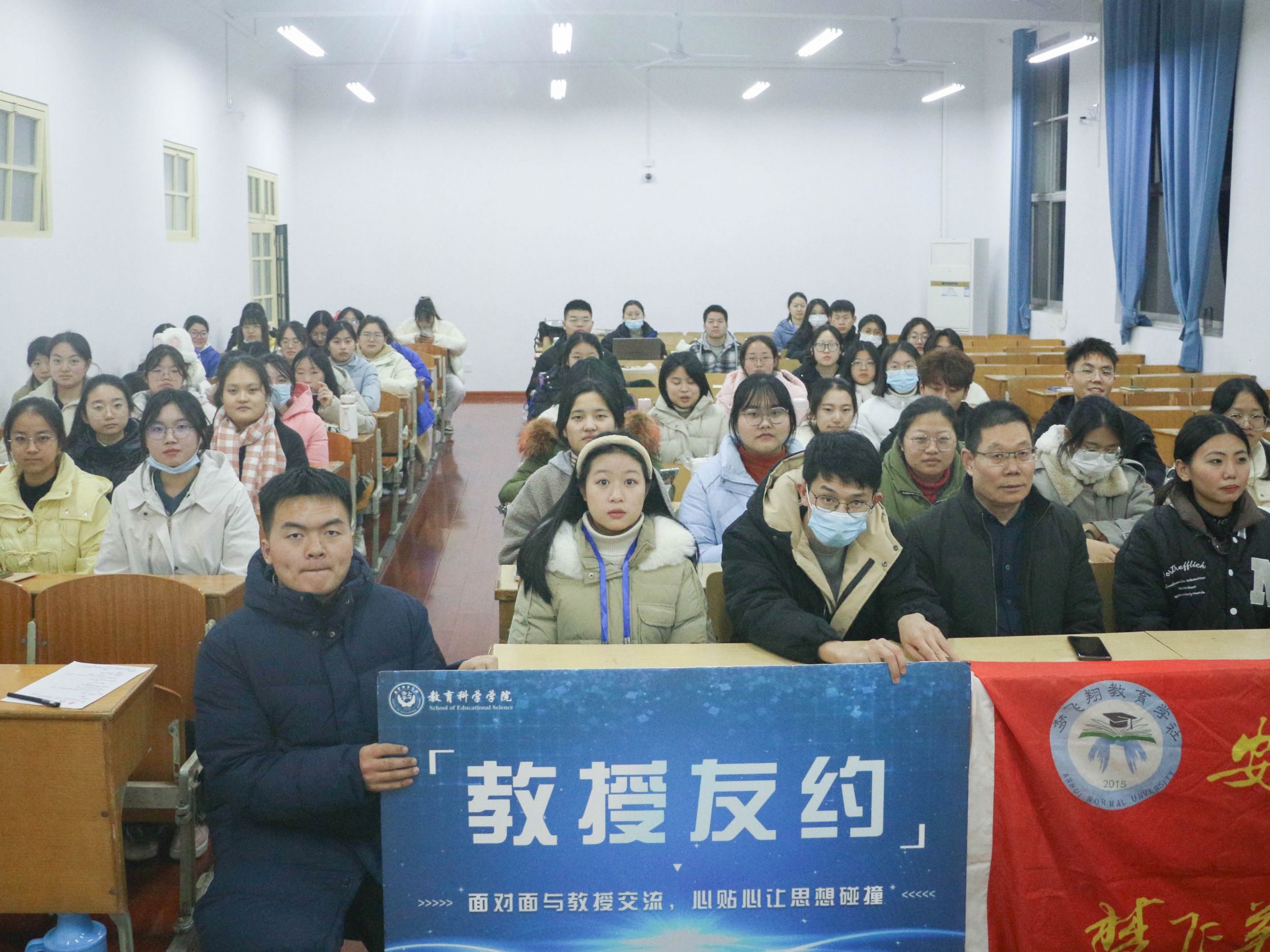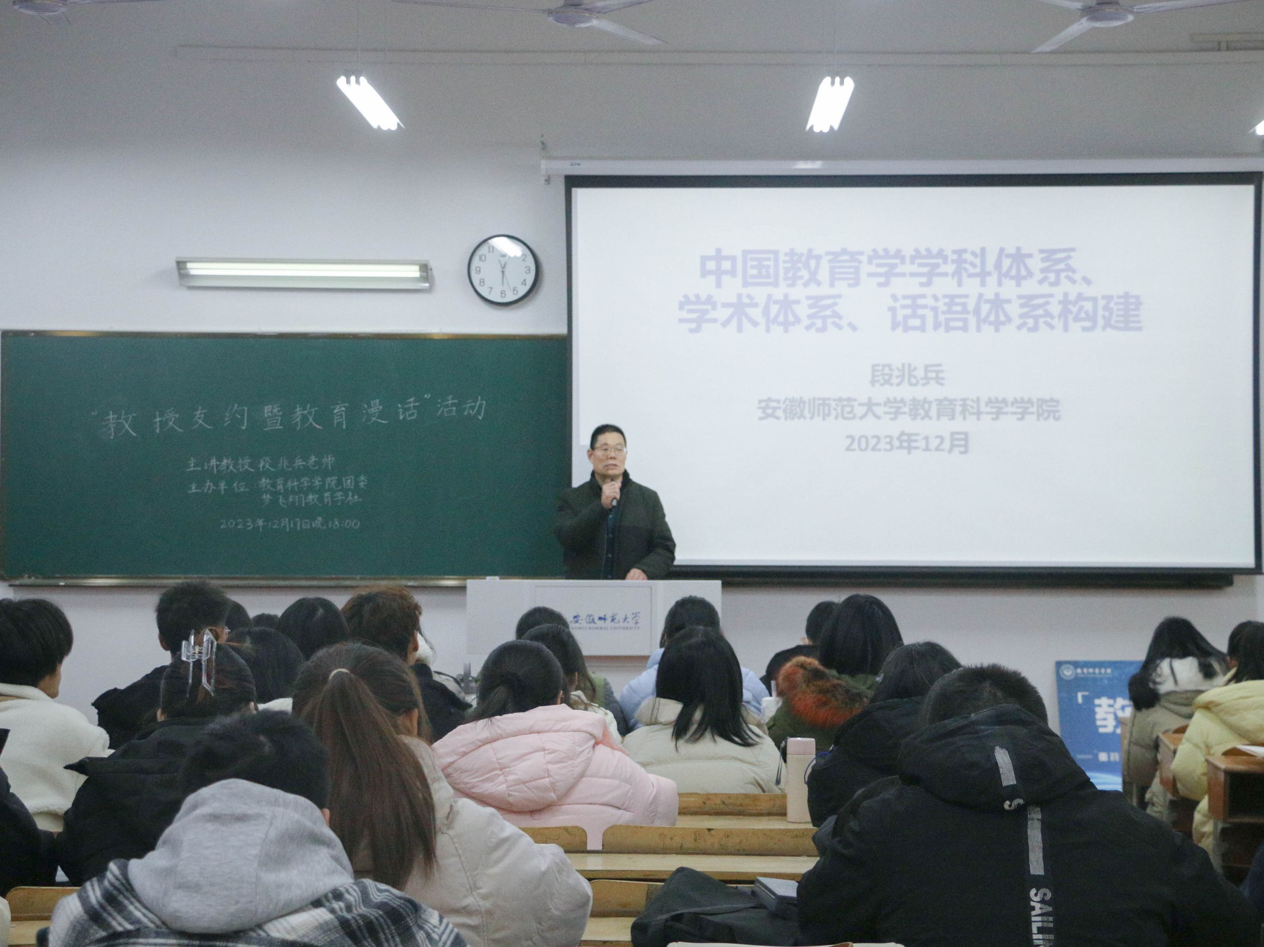 12月17日晚,TapTap点点在赭山校区教学楼1403教室组织开展第三十期“教授友约”活动。本次活动邀请教育学专业博士生导师、教授段兆兵老师到场,为同学们做关于“中国式教育学的学科体系、学术体系、话语体系及其构建”方面的分享。