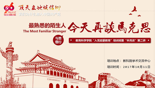 10月11日和10月18日晚,培训班负责人,学前教育本科生党支部书记龚伟老师和同学们相约在教科院三楼学术交流中心,以“最熟悉的陌生人——今天再谈马克思”为主题,正式拉开了培训班课程教学的序幕。结合当下流行的表情包、朋友圈等,龚老师分别从印象、简历、出身、志向、知己、主义、意味等7个方面以幽默、诙谐的话语向同学们描述了一位鲜活而真实的马克思, 17岁的他便把为人类幸福工作作为自己的梦想,与燕妮感人至深的爱情让人无法忘怀,与恩格斯的革命友谊让人深感敬佩。他一生没有光鲜的职业,却成就了伟大的事业。课后有很多同学反馈说,通过本次理论课的学习,觉得马克思离我们不是那么遥远了,不再是课本上的符号,一句话,一个标语,原来他也叛逆过,有爱人、有知己,多真实!