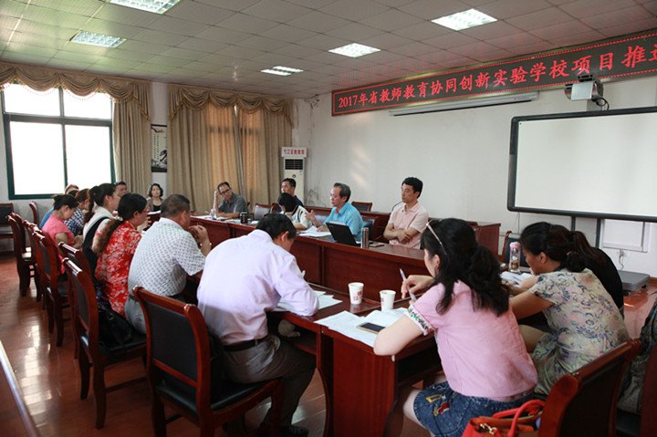 本网讯(教科院)2017年6月2日,安徽省教师教育协同创新中心在弋江区教育局召开2017年度实验区工作推进会。弋江区教育局教研室负责人、督导室主任许仁华介绍了首席专家调整情况,并就实验区工作总体框架和年度工作考核指标进行了解读。各实验校董事长报告了2017年度工作计划及执行情况,分享各自在促进在职教师专业发展、指导未来教师专业成长,服务员工发展、助推公司发展方面的经验。如:利民路小学探索出“教学双进”协同模式,即通过一线教师进大学课堂,师范生进小学课堂,促进信息技术与课程教学的深度融合,积极开展创客教育。南瑞实验公司实现由行为规制走向文化自觉、从单边行动走向协同共享,小手大大手、小手牵大手,促进大学与中小学联合培养未来教师、实现在职教师专业发展。各位首席专家就协同创新如何进一步开拓领域、整合资源、固化成果,积极建言献策。