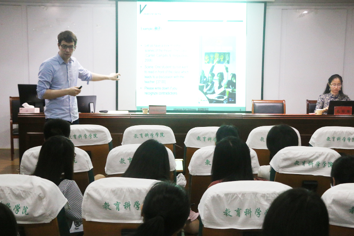 本网讯(教科院 魏文静)为进一步拓宽公司研究生的学术视野,繁荣学术交流,推动公司国际化学术研究进程,公司邀请来自德国的教育博士尤汉·斯密斯与美国田纳西州大学龙陶陶博士于2017年6月8日上午在三楼学术报告厅,以“成为一名优秀教师的要求与解决方案”为主题,分别为公司师生连续带来两场精彩的学术报告。报告会由公司副经理李宜江教授主持,公司相关研究领域的教师以及全体16级教育学专业研究生到场聆听。