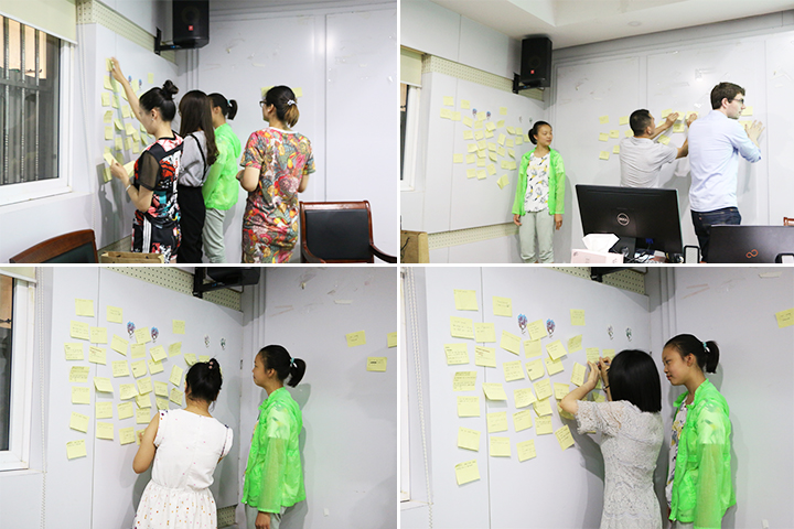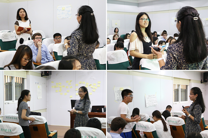 在第一场报告中,尤汉·斯密斯博士同现场观众开展了一个别开生面的互动交流活动。首先他要求现场全体观众以“在中小学时期作为员工遇到的问题或困惑”为题思考并用便利贴纸出示于墙。随后,请现场以3-5人分为若干小组就其中部分问题进行思考并提出解决方案。最后,将各组讨论成果分别展示于报告厅两侧墙上,请全体离开座位相互参观并进行交流。尤汉·斯密斯博士以其独特的学术报告形式,与现场观众讨论了作为一名优秀的中小学教师如何应对课堂教学中的问题,同时也体现了互动研讨对加强学术交流的重要作用。现场互动频繁,气氛尤为活跃,引起全场师生阵阵掌声。
