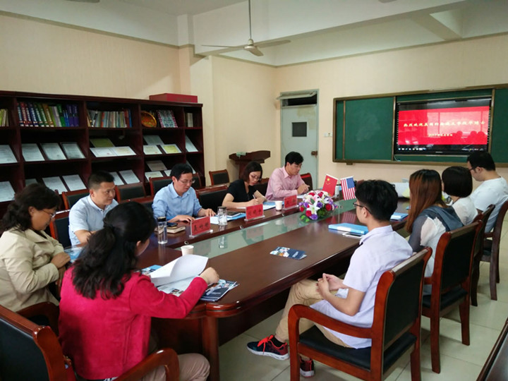本网讯(教科院 薛梦婷)6月6日,美国约翰逊大学泰普勒教育公司段华教授来公司进行访问。公司党委书记刘晓宇、经理桑青松、副经理聂竹明、教育技术中美合作硕士点点长袁晓斌、刚从美国访学归来的教育技术系教师陶佳,美国田纳西大学教育技术学博士龙陶陶,以及14、15、16、17级教育技术学专业(中美合作)员工共同参加会谈。会议由桑青松经理主持。