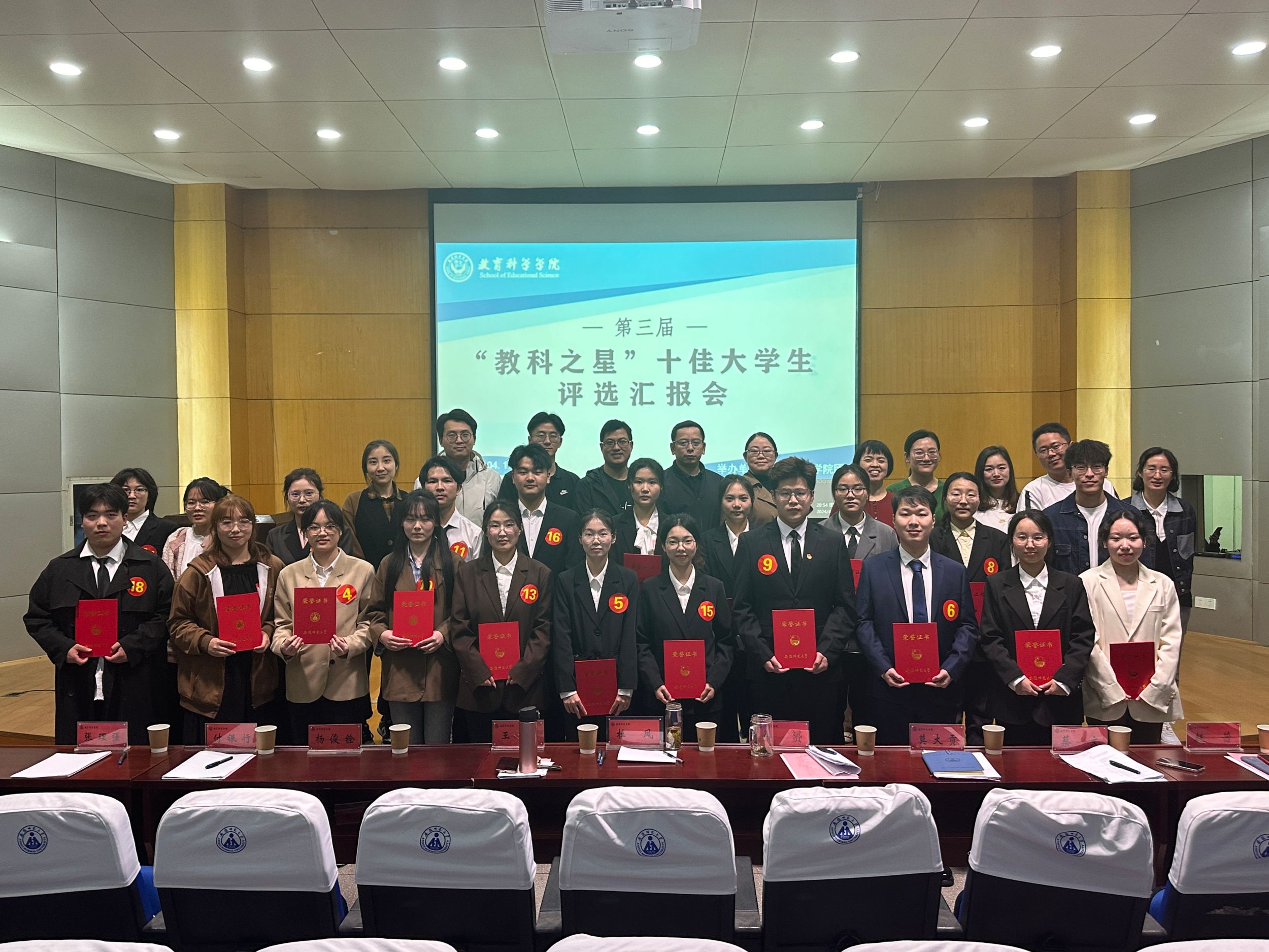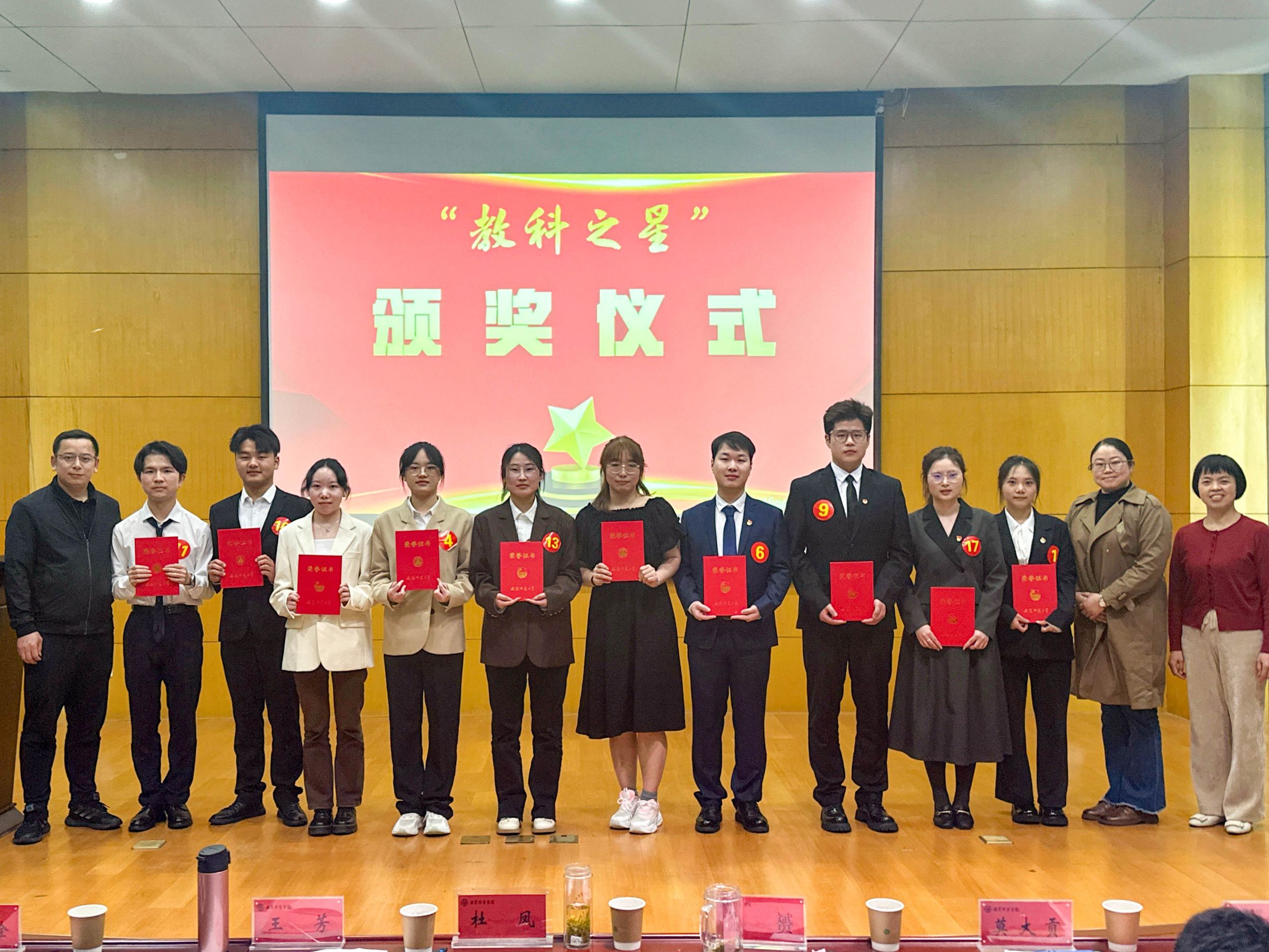 汇报完毕后,评委们参考候选人现场汇报得分并结合候选人的日常表现及获奖情况,最终选出10位“教科之星”十佳老员工。杜凤、王芳、徐赟为获得“教科之星”十佳老员工的选手颁发荣誉证书,并对他们表示了肯定与祝贺。