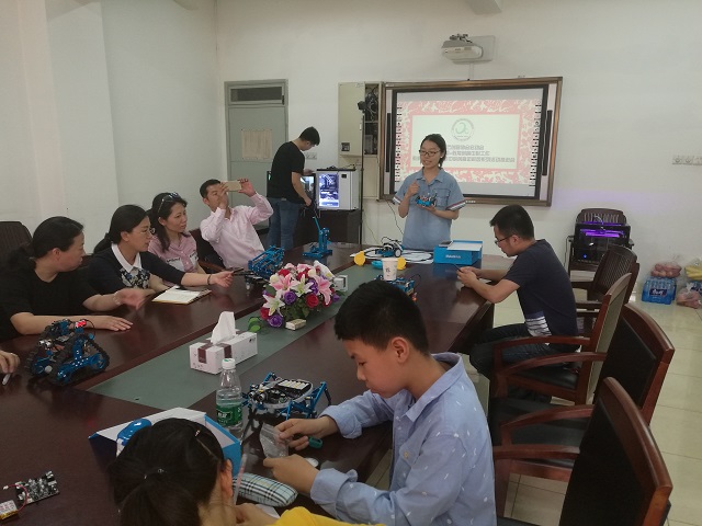 随后,张如华向青芒创客协会进行授旗。青芒创客协会的会旗由两个“C”组成芒果的形状,以青绿色为底色。寓意为“青年创客,展现锋芒”。社团代表对创客课程、科技产品进行了详细的介绍,来参加此次会议的员工进行了小车组装、操作体验,现场感受创客的乐趣。