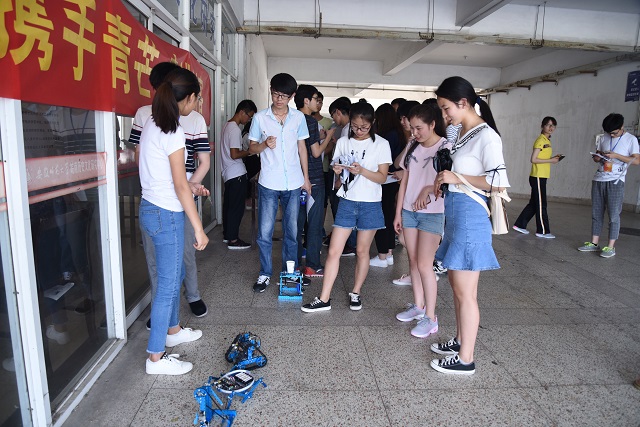 5月18日下午,青芒创客协会举办了第一次社团活动--“携手青芒,走进创客”。活动主要分为六个部分:VR交互体验、小车避障操作、小车扎气球比赛、机械臂夹纸杯体验、脑电波风扇体验及各种机器人展示。同学们的积极性很高,尤其是VR体验,排起了长长的队。在机械臂夹纸杯比赛中,同学们体验到了通过手机端操控小车的乐趣。