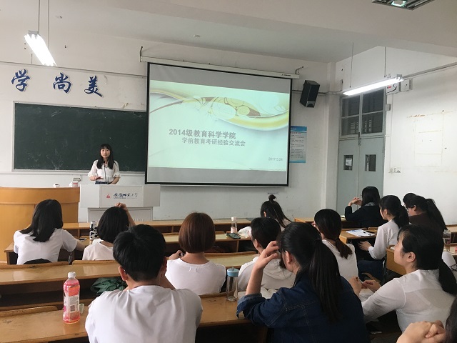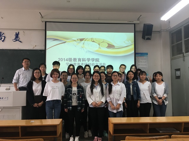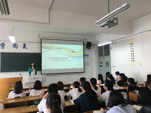 本网讯(教科院 陈靖仪)考研经验分享,逐梦助力成长。5月24日下午,2014学前教育专业考研经验交流会在田楼8401正式召开。此次动员会由专业负责人张更立老师组织举办,杨颖慧老师担任嘉宾,考取浙江师范大学的汪琦琦同学,被华东师范大学录取的许营营同学以及考取安徽大学的潘显敏学姐作为主讲人与在座的2014级学妹分享了考研路上的心得体会。
