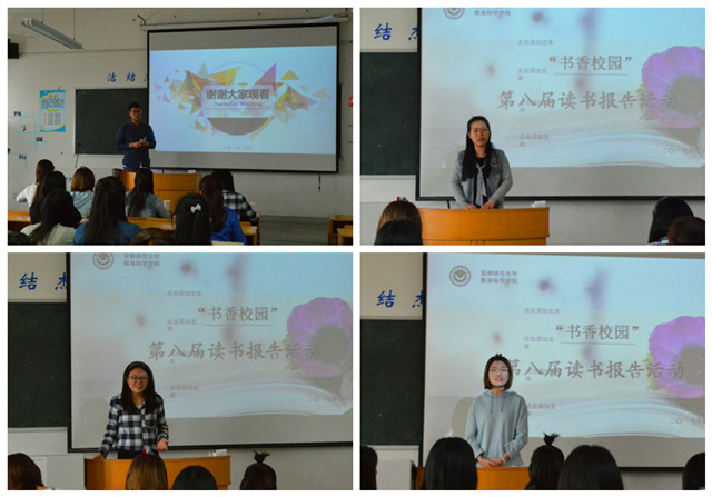 为了迎接“世界读书日”的到来,教科院特举办“书香校园”读书报告会评选活动。参赛者结合自身爱好与专业,以PPT形式作读书报告,从多角度向大家推荐并介绍了自己所选择的书籍。这次读书报告会,不仅培养了参赛同学队经典书籍的理解与鉴赏能力,也增长了同学们对读书的热情,营造了良好的校园读书氛围。