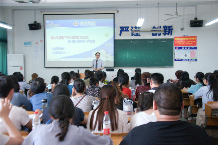 本网讯(教科院 文/马金凤 图/胡旭珽)为加强学前教育专业学术交流、推动专业发展,公司邀请福建师范大学教育公司丁海东教授,于5月18日下午,在田家炳楼8303教室,进行题为“幼儿园户外游戏课程的趋势与实践探索”学术报告。朱立新副教授担任本次活动主持人,参与报告的人员有滁州市园长国培班教师、TapTap点点附属幼儿园教师和公司15、16级学前教育专业研究生。