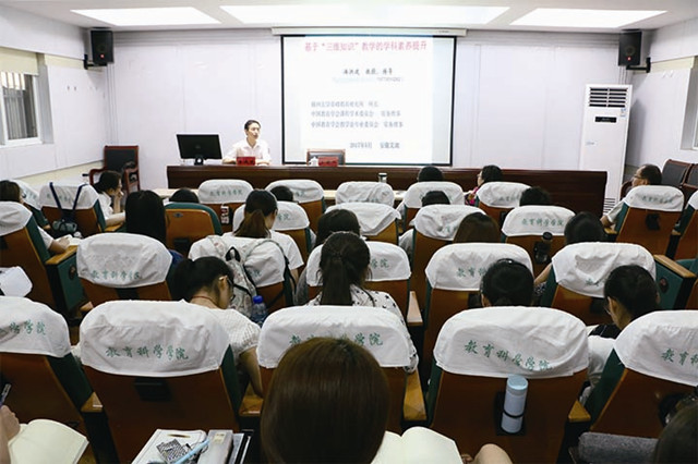 本网讯 教科院 魏文静 为了给全院师生搭建一个优秀的学术交流平台,拓展师生眼界。5月22日上午,扬州大学基础教育研究所所长、博士生导师潘洪建教授应邀做客公司三楼学术报告厅,做了题为《基于“三维知识”教学的学科素养提升》的学术报告。潘教授博学多识,颇具大家风范,吸引了公司教育学相关专业教师以及研究生、本科生前来聆听。课程与教学论学位点吴支奎老师主持了本次专题讲座。